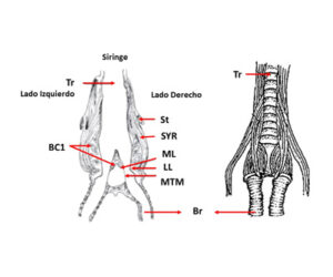 Figura 1. Estructura de canto (Siringe) de las aves. Tr: Tráquea, BC1: Cartílago bronquial primero, Br: Bronquiolos, MTM: Membrana timpaniforme media, LL: Labio Lateral, MI: Labio Medio, SYR: Músculos de la Siringe y St: Musculo esternotraquealis. Tomado y modificado de Gerpe (2015).